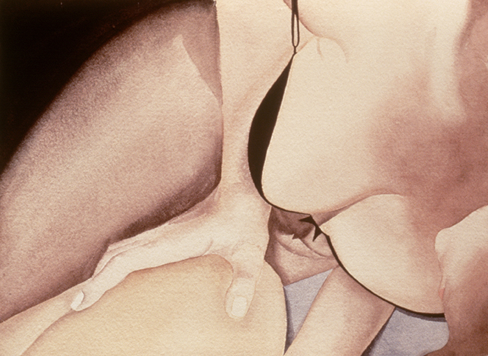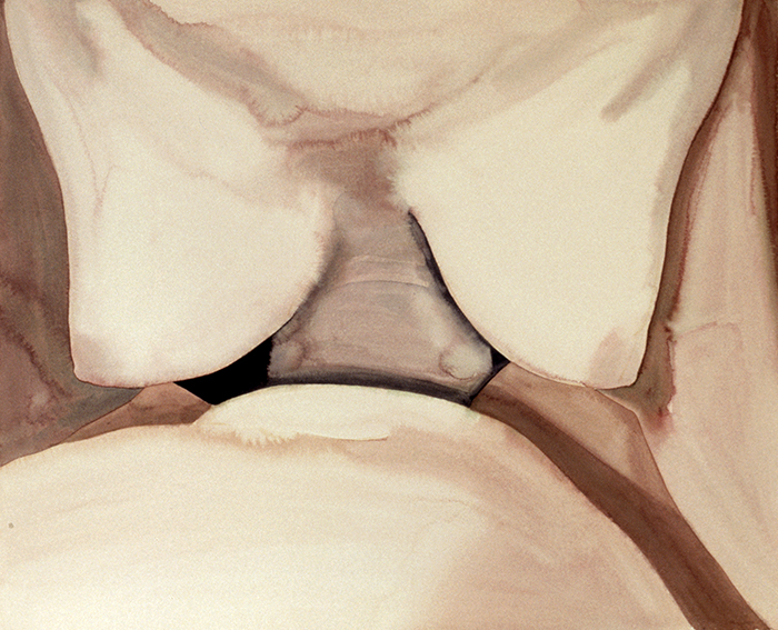 Prompted by one of Cronin’s favorite paintings, Gustave Courbet’s “The Sleepers” (1866), she wondered, “What do I do if I’m one of those women AND the cultural producer? What does it look like from within our erotic space?” The artist placed herself, the cultural producer, simultaneously into the roles of nude female object (traditional) and artist/subject (untraditional). Cronin balances the boldness of her critique by subverting the ladylike medium of watercolor to depict female sexuality with frank directness.