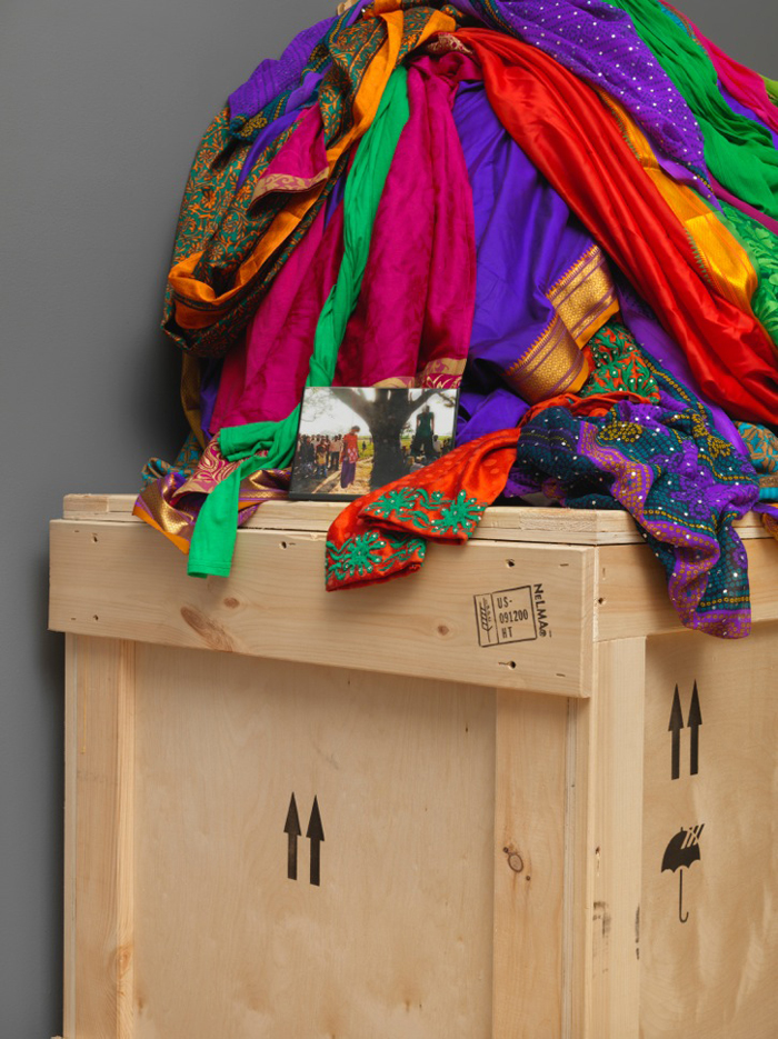 Shrine For Girls (Uttar Pradesh), saris, framed photograph and wood crate (Detail)