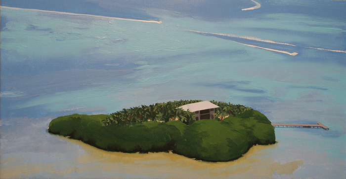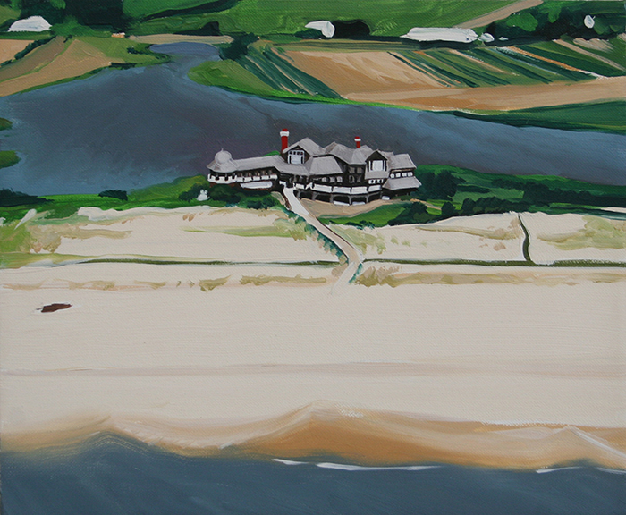 When I think about them historically, they conjure up images of Dutch seventeenth-century landowners and their houses. Although my 21st century versions have no horizon lines because the vantage point of the source photos are aerial. This requires hiring a plane, a pilot, and a specialized aerial photographer. My feet are on the ground; these properties are otherworldly and beyond reach. In all my work I construct a critical vision of a life and lifestyle that are beyond the means of most Americans, but desired by many.