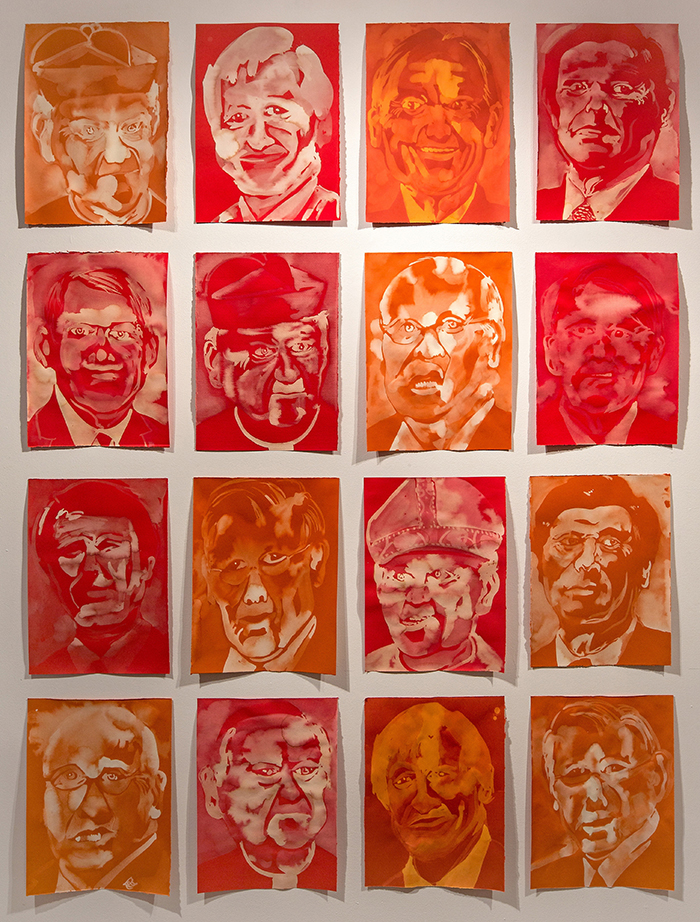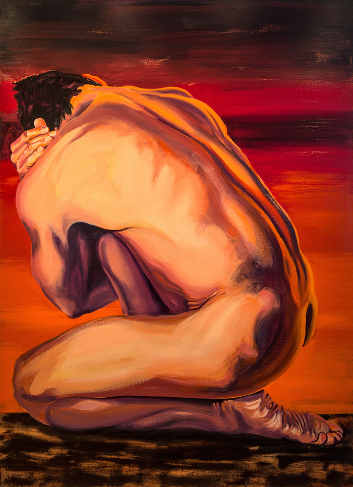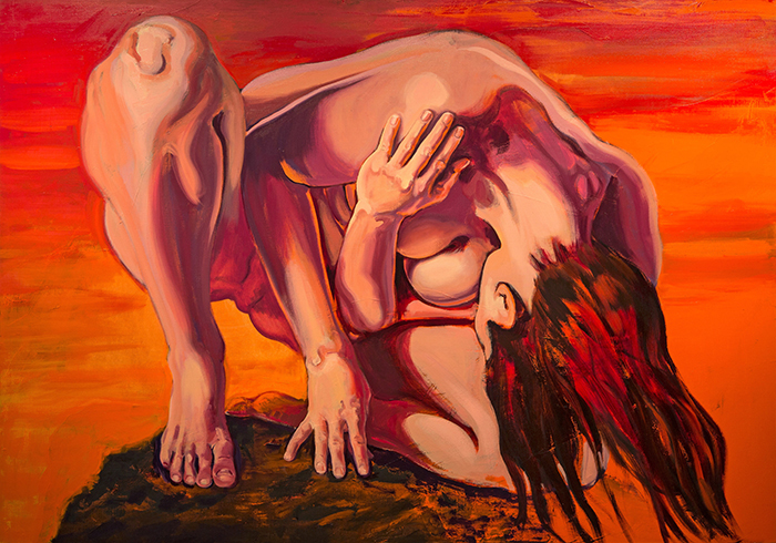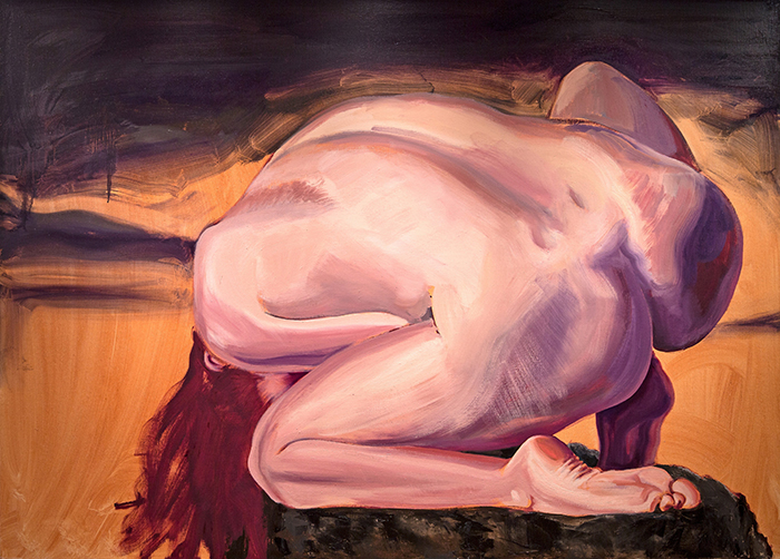 The painterly figures that Cronin creates take their visual cues from over seven centuries of artistic interpretations, beginning with 14th century illuminated manuscripts up to Italian fashion magazines, in addition to tracings of the artist’s own body and her archive of personal photographs taken throughout Italy. With a deft understanding of her materials, Cronin allows the figures to take shape in natural states and creates surfaces with both bold and meticulous strokes. With an intense palette of reds, oranges, cool blues and purples, the artist depicts the dead and the hell of their own design.