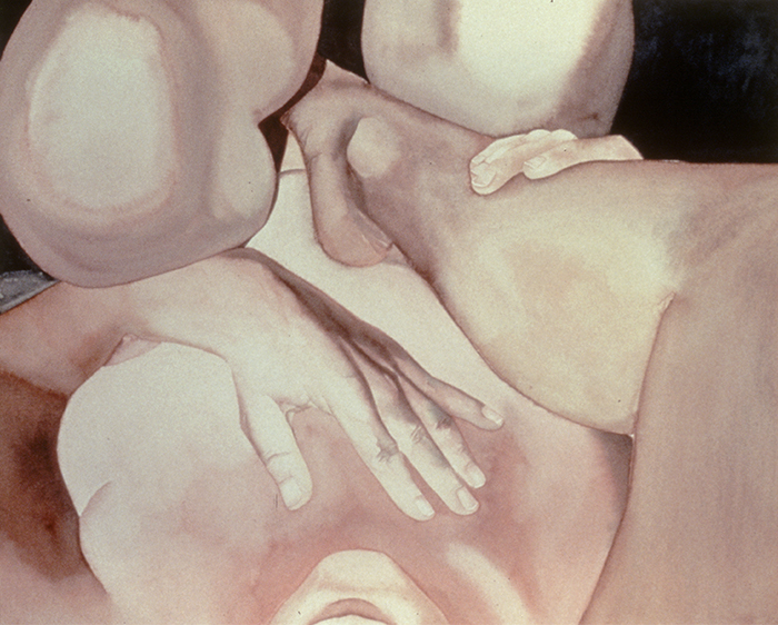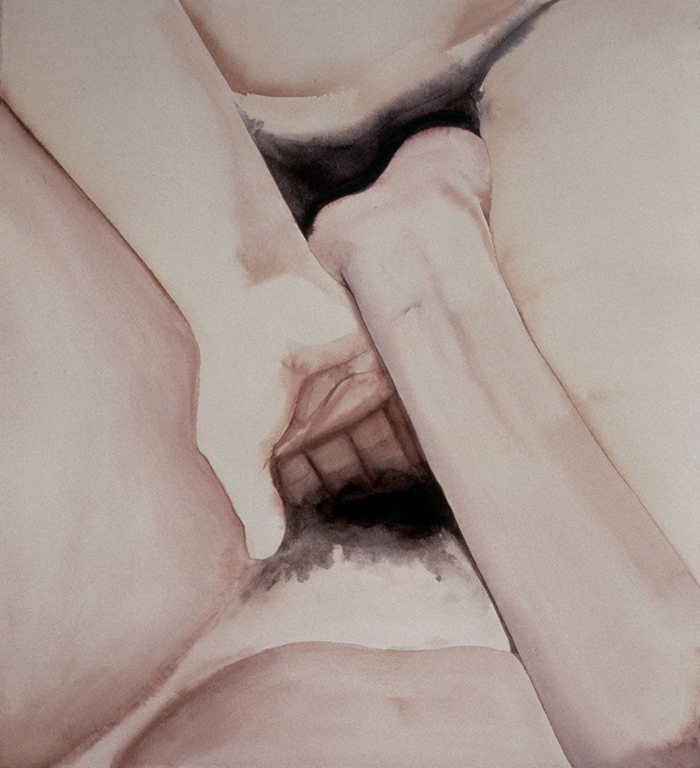 Prompted by one of Cronin’s favorite paintings, Gustave Courbet’s “The Sleepers” (1866), she wondered, “What do I do if I’m one of those women AND the cultural producer? What does it look like from within our erotic space?” The artist placed herself, the cultural producer, simultaneously into the roles of nude female object (traditional) and artist/subject (untraditional). Cronin balances the boldness of her critique by subverting the ladylike medium of watercolor to depict female sexuality with frank directness.