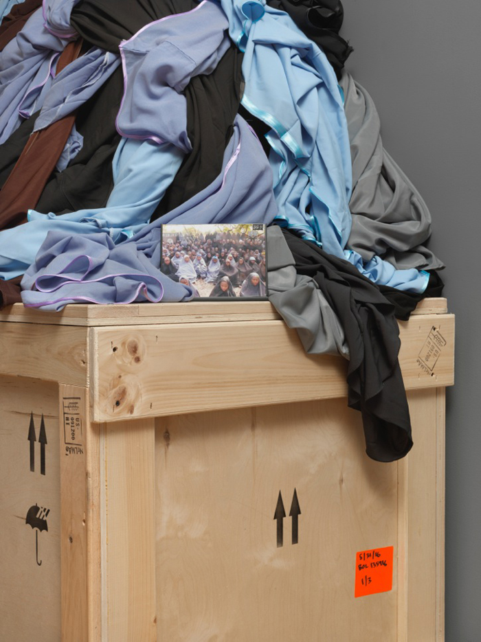 Shrine For Girls (Chibok), hijabs, framed photograph and wood crate (Detail)