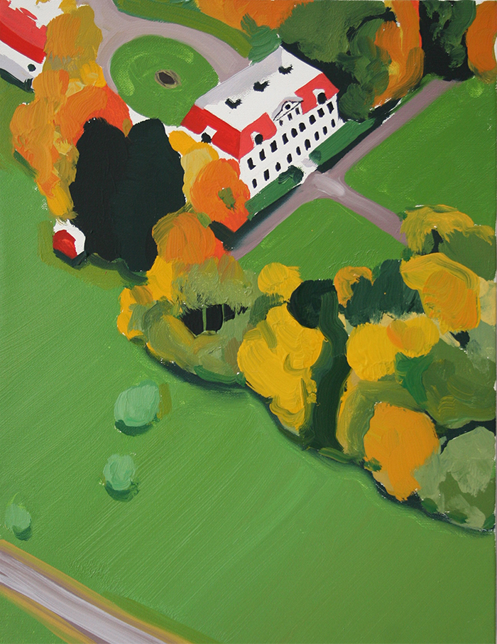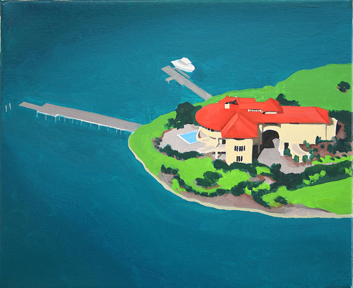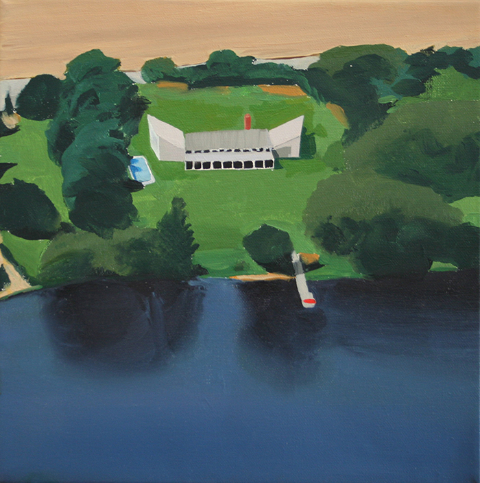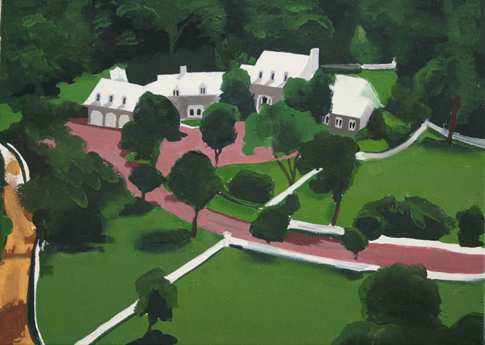 When I think about them historically, they conjure up images of Dutch seventeenth-century landowners and their houses. Although my 21st century versions have no horizon lines because the vantage point of the source photos are aerial. This requires hiring a plane, a pilot, and a specialized aerial photographer. My feet are on the ground; these properties are otherworldly and beyond reach. In all my work I construct a critical vision of a life and lifestyle that are beyond the means of most Americans, but desired by many.