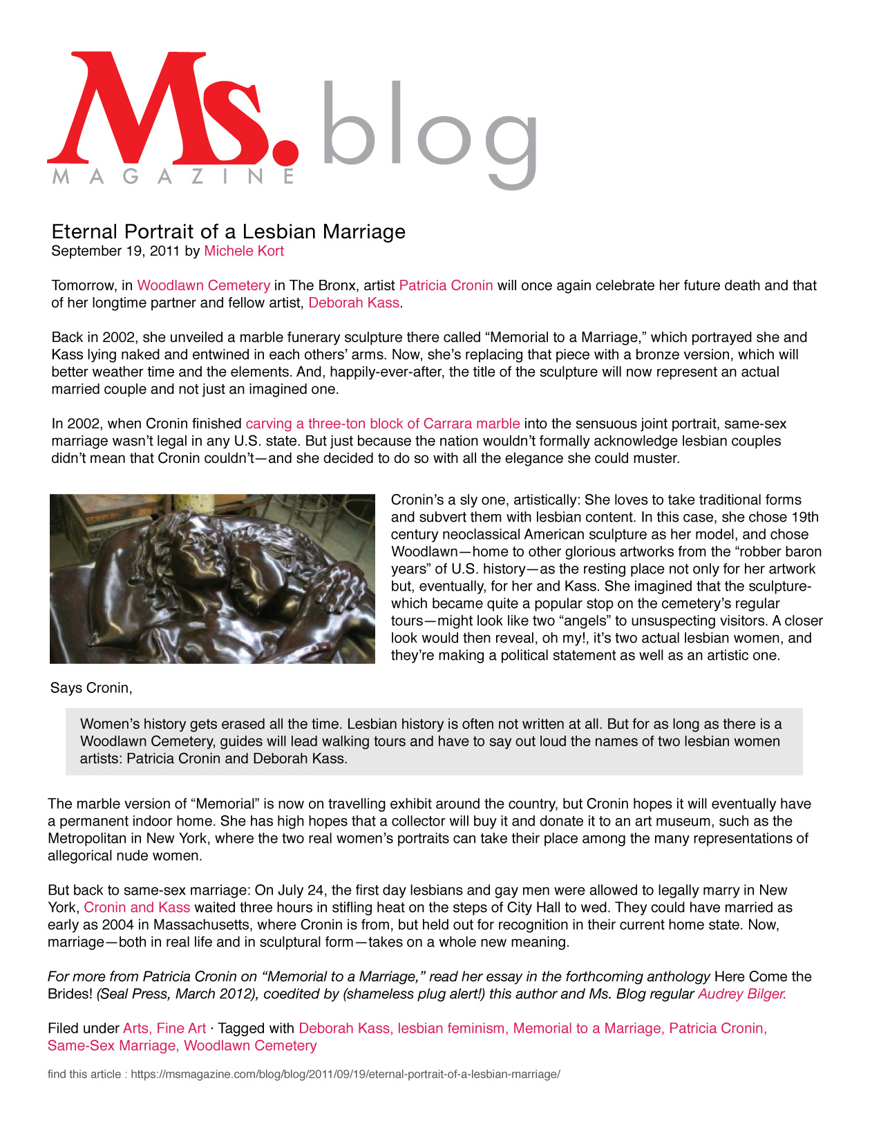 "Out Artist Patricia Cronin's New Sculpture"