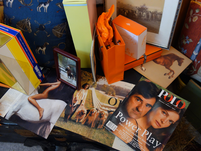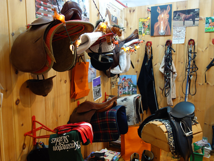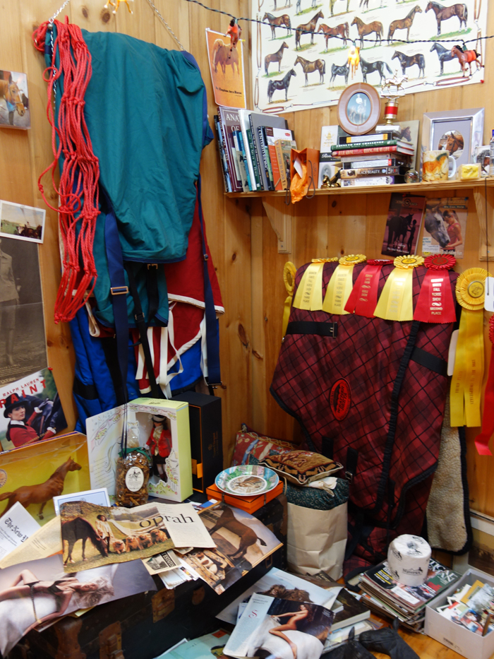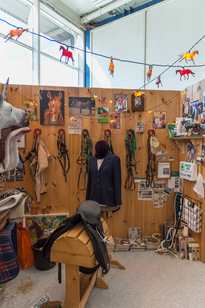 Cronin hand built the wooden paneled 12’ x 12’ architectural immersive installation replicating the part a stable on a large estate where all the equestrian accoutrements are stored and filled it with “ready-made” found objects and handmade art works, including authentic equipment: saddles, bridles, whips, and crops; clothing: breeches, suede chaps, gloves and helmets; nutrition and veterinarian aids: bandages, vitamins, treats, ointments, and oils; sporting materials: magazines, ribbons, trophies, and posters; and included the artist’s bronze horse sculptures and equine oil portrait paintings.